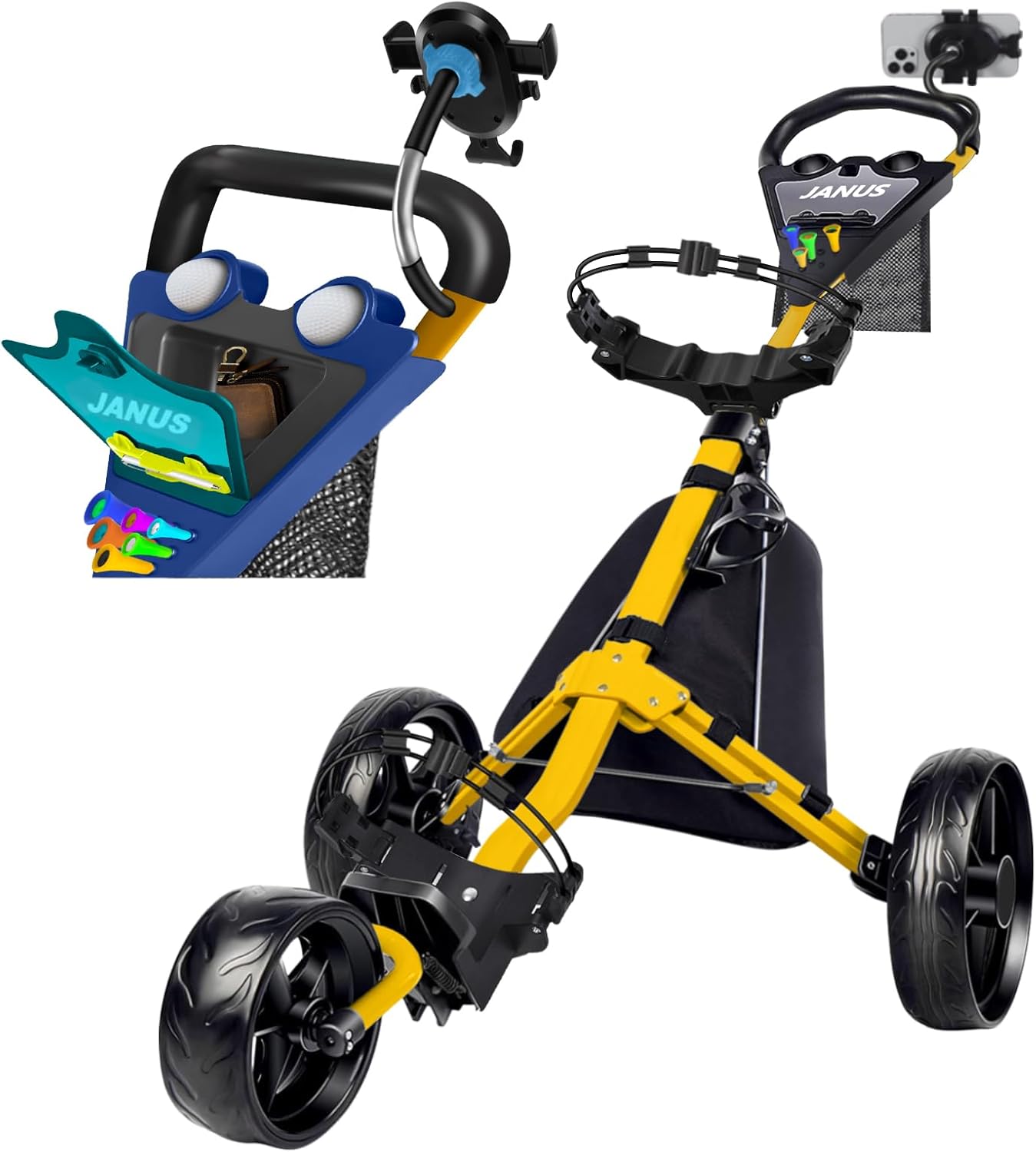 JANUS Golf Cart, Golf Bag cart, Foldable Golf Push cart, Golf Pull cart,3 Wheel Golf Push cart with Gooseneck Phone Holder